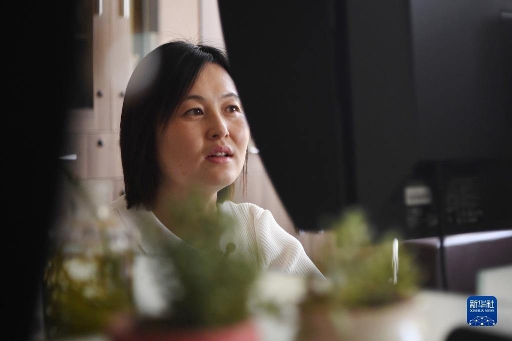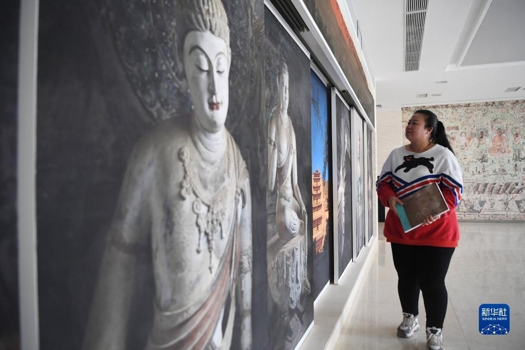 敦煌研究院文物數(shù)字化保護團隊圖像處理人員年海麗從莫高窟照片墻前走過(4月25日攝)。