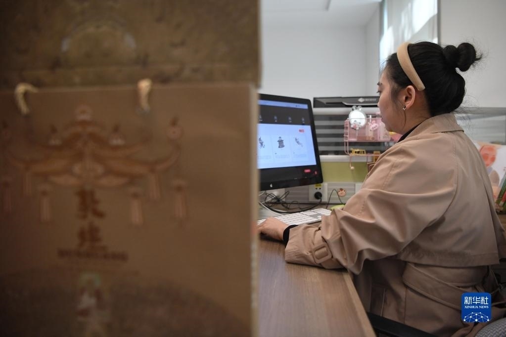 敦煌研究院文物數(shù)字化保護團隊創(chuàng)意營銷人員廖雪婷在整理文創(chuàng)產(chǎn)品(4月25日攝)。
