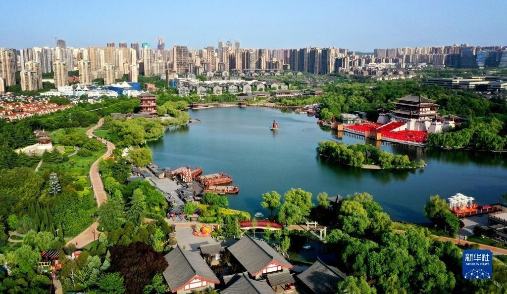 西安大唐芙蓉園(4月25日攝,無(wú)人機(jī)照片)。