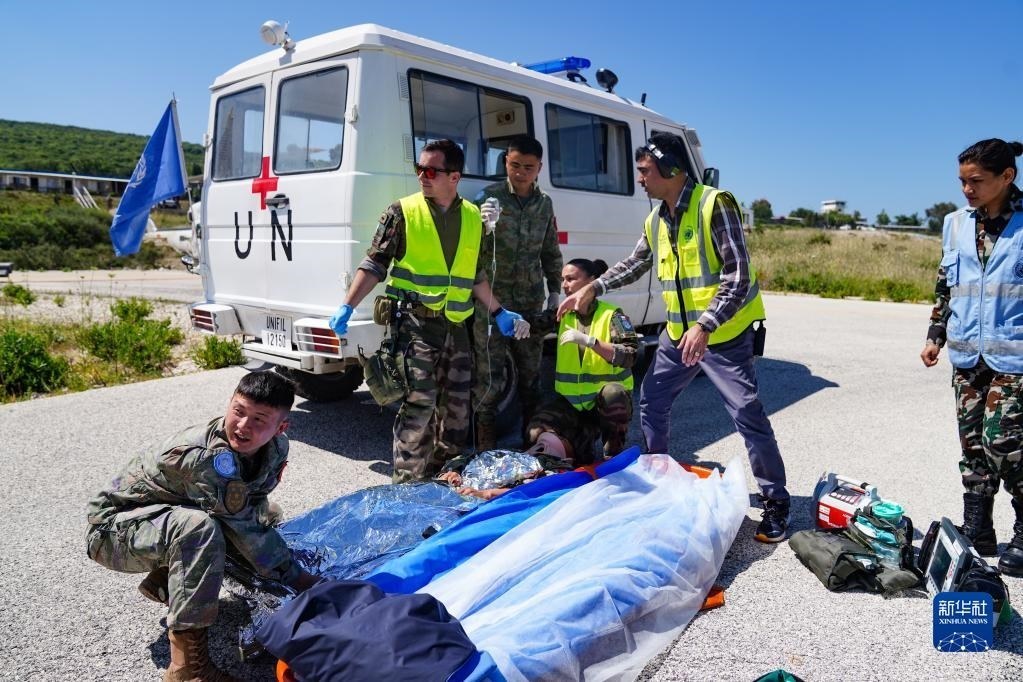 5月3日,在黎巴嫩南部邊境“藍線”附近雷場,參與演習(xí)的中國第21批赴黎巴嫩維和多功能工兵分隊隊員同外軍醫(yī)療分隊交接。