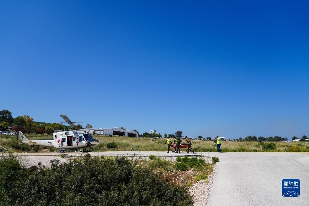 5月3日,在黎巴嫩南部邊境“藍線”附近雷場,參與演習(xí)的中國第21批赴黎巴嫩維和多功能工兵分隊隊員使用救援直升機轉(zhuǎn)運“傷員”。