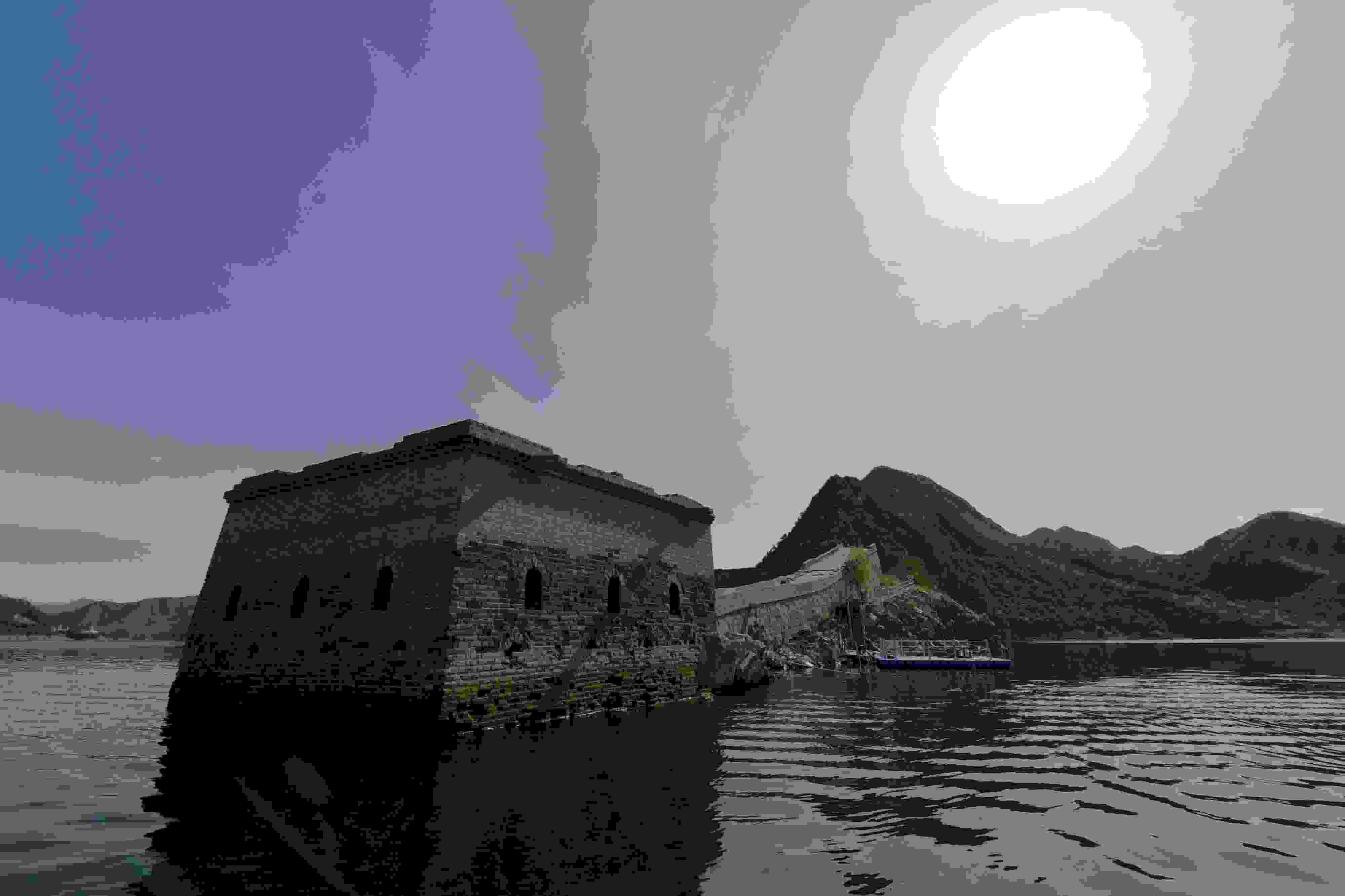 2023年5月8日,河北承德,寬城滿族自治縣境內(nèi)潘家口水庫的“水下長城”。這段“水下長城”是明長城的遺址,20世紀(jì)70年代因建設(shè)水利樞紐工程,部分長城隱沒水下,從而形成“水下長城”景觀。 視覺中國