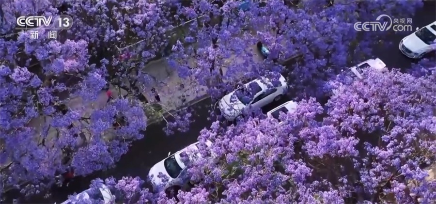 總臺記者 郭琳潔:我現在是在昆明的教場中路,5月上旬,道路兩側的藍花楹競相綻放,將這條1.4公里長的道路裝扮成一條紫色長廊。