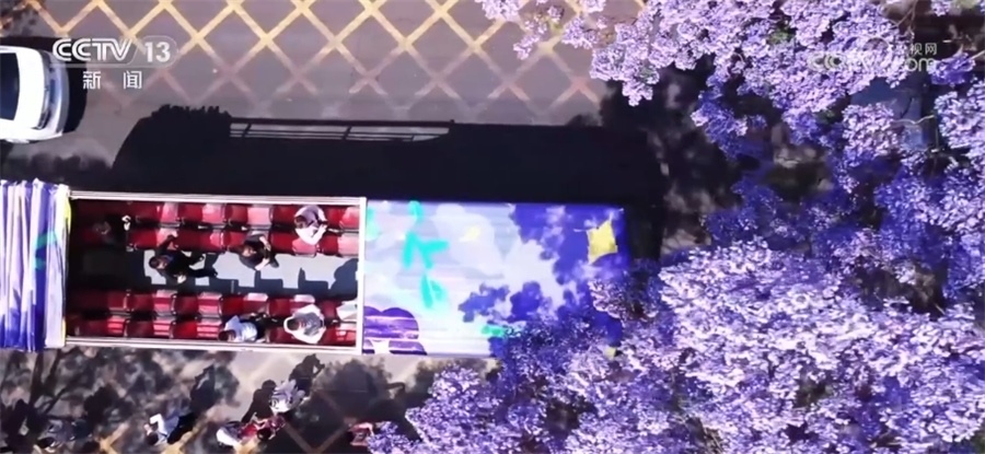 教場中路所屬的蓮花街道打造了藍花楹主題街區(qū),推出精美文創(chuàng)產品,開設賞花專列巴士,推出一系列相關文化藝術活動,豐富市民游客的賞花體驗。