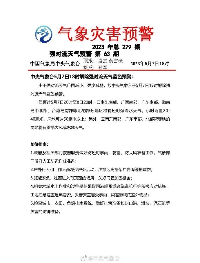 央視網(wǎng)消息:中央氣象臺5月7日18時解除暴雨藍(lán)色預(yù)警和強(qiáng)對流天氣藍(lán)色預(yù)警。
