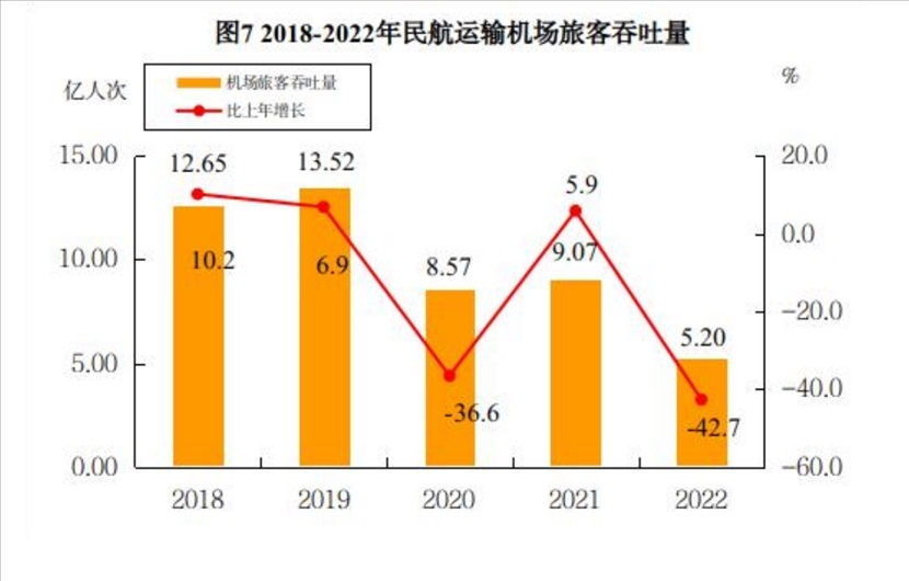 2018年至2022年民航運(yùn)輸機(jī)場旅客吞吐量。來源于2022年民航行業(yè)發(fā)展統(tǒng)計公報