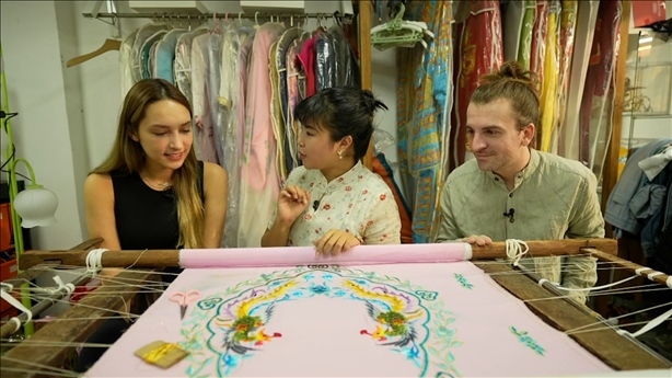 “老板,我是來做戲服模特”“我來考察非遺文化項目”美國的潘明花和意大利徐天佑一起來到狀元坊戲服工廠,戲服刺繡傳承人何鳳婷熱情地講述著戲服刺繡的歷史、制作工序、角色樣式,也讓他們親自體驗了刺繡。潘明花驚嘆于刺繡工藝遠(yuǎn)比想象中要復(fù)雜得多。他們穿著戲服走近粵劇博物館,深入了解以粵劇為代表的嶺南文化。徐天佑表示戲服刺繡非遺的傳承不僅是技術(shù)工藝的傳承,同時也是文化的傳承。何鳳婷說如何讓更多年輕人喜愛和關(guān)注這項手藝,如何能繼續(xù)傳承下去是目前亟待解決的問題。為了讓刺繡與現(xiàn)代審美相結(jié)合,老板將刺繡工藝與年輕人喜愛的IP玩偶組合,將“激活非遺+創(chuàng)新思路+文化傳承”理念融入到刺繡中,讓這門手藝更面向大眾,推動非遺的創(chuàng)造性轉(zhuǎn)化,提高與現(xiàn)代生活的緊密度,成為融入現(xiàn)代生活中的潮流元素,讓非遺重?zé)ü獠省?/p>