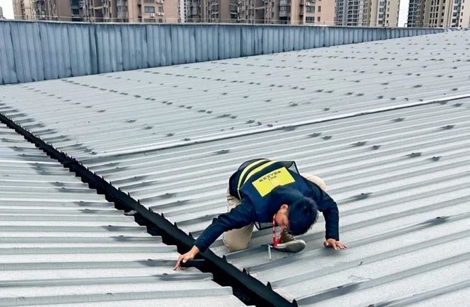 ▲“梅花”臺風(fēng)將至,2022年9月14日16時(shí),人保財(cái)險(xiǎn)浙江溫州永嘉支公司青年員工趕在臺風(fēng)前走訪重點(diǎn)企業(yè)開展防災(zāi)檢查。他不懼危險(xiǎn),爬上客戶廠房棚頂查看密封情況,只為確保廠房安全。
