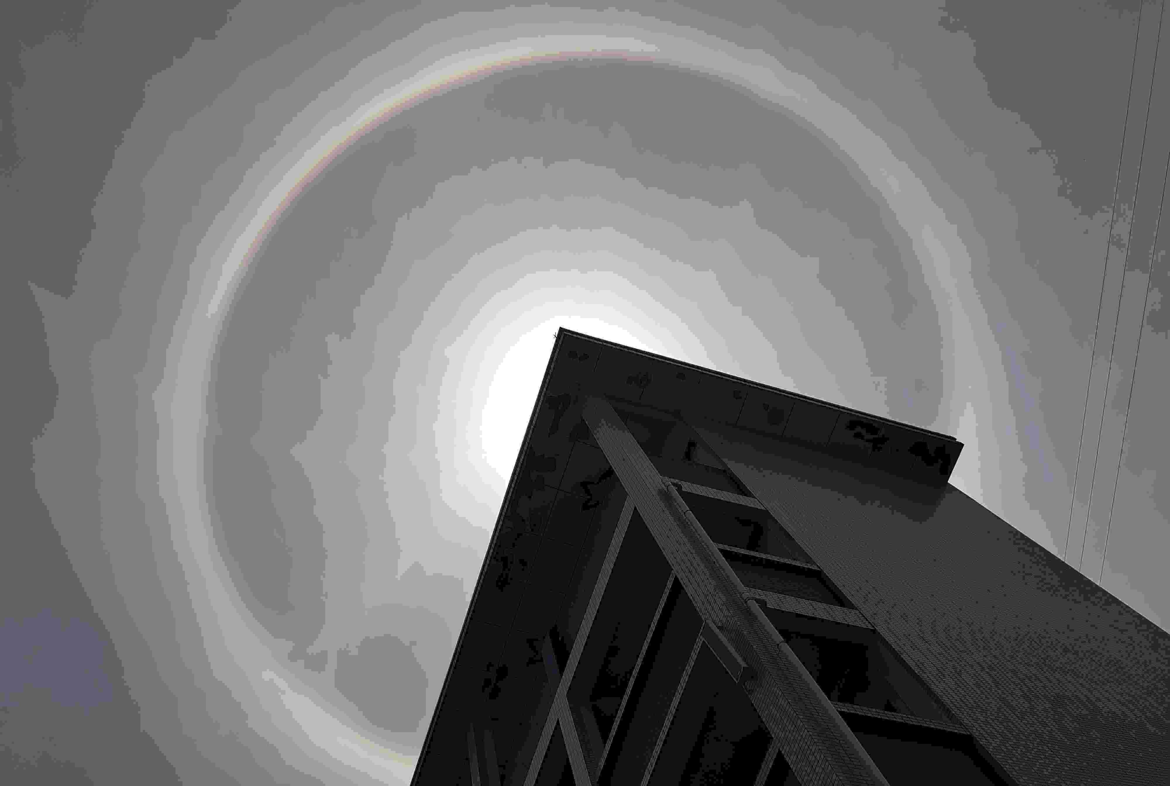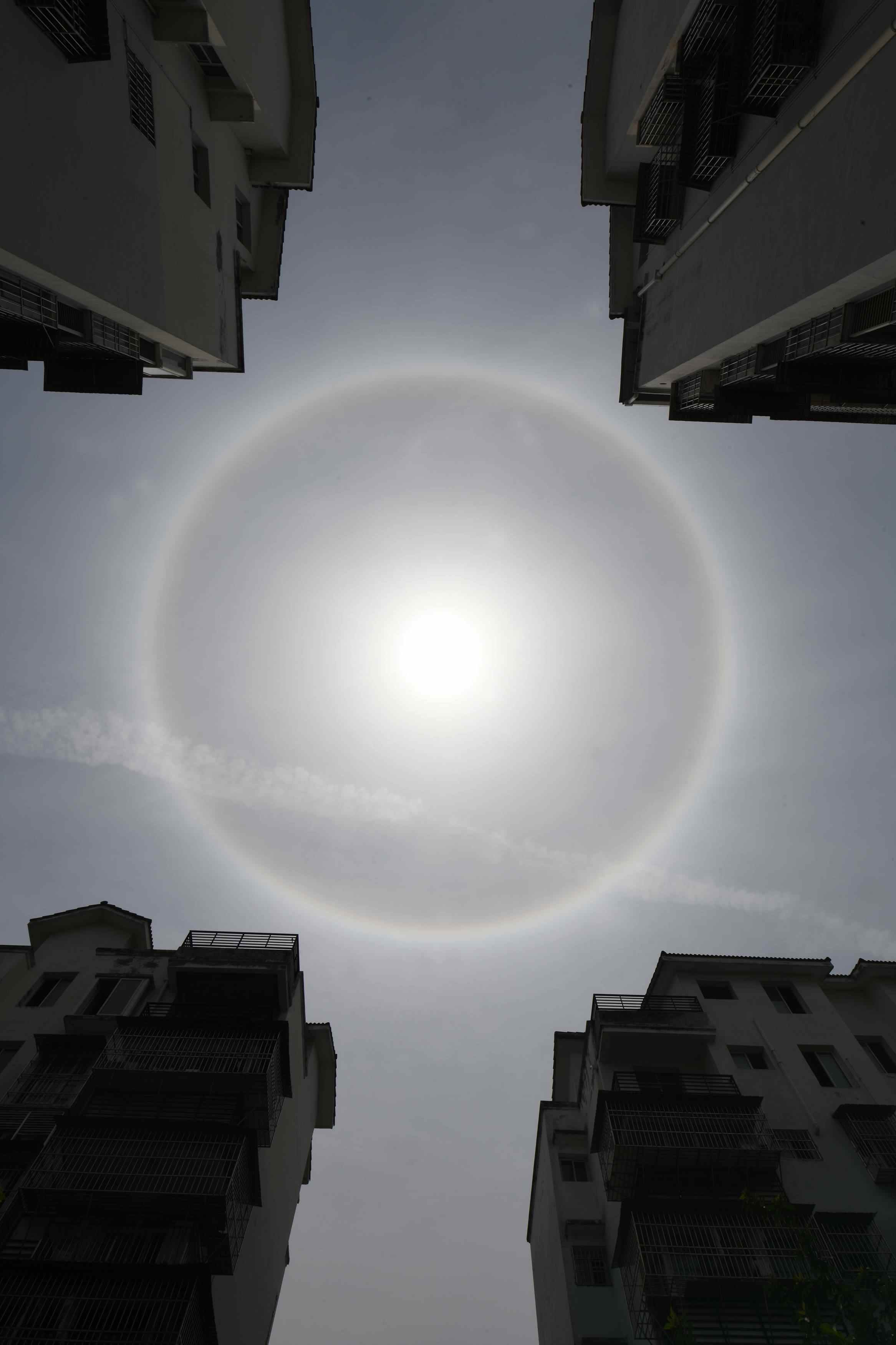 2023年5月15日中午,湖北宜昌,天空出現(xiàn)日暈景觀。當日,多地天空出現(xiàn)日暈。日暈是一種大氣光學(xué)現(xiàn)象,是太陽光通過云層中的冰晶折射或反射而形成的。 視覺中國