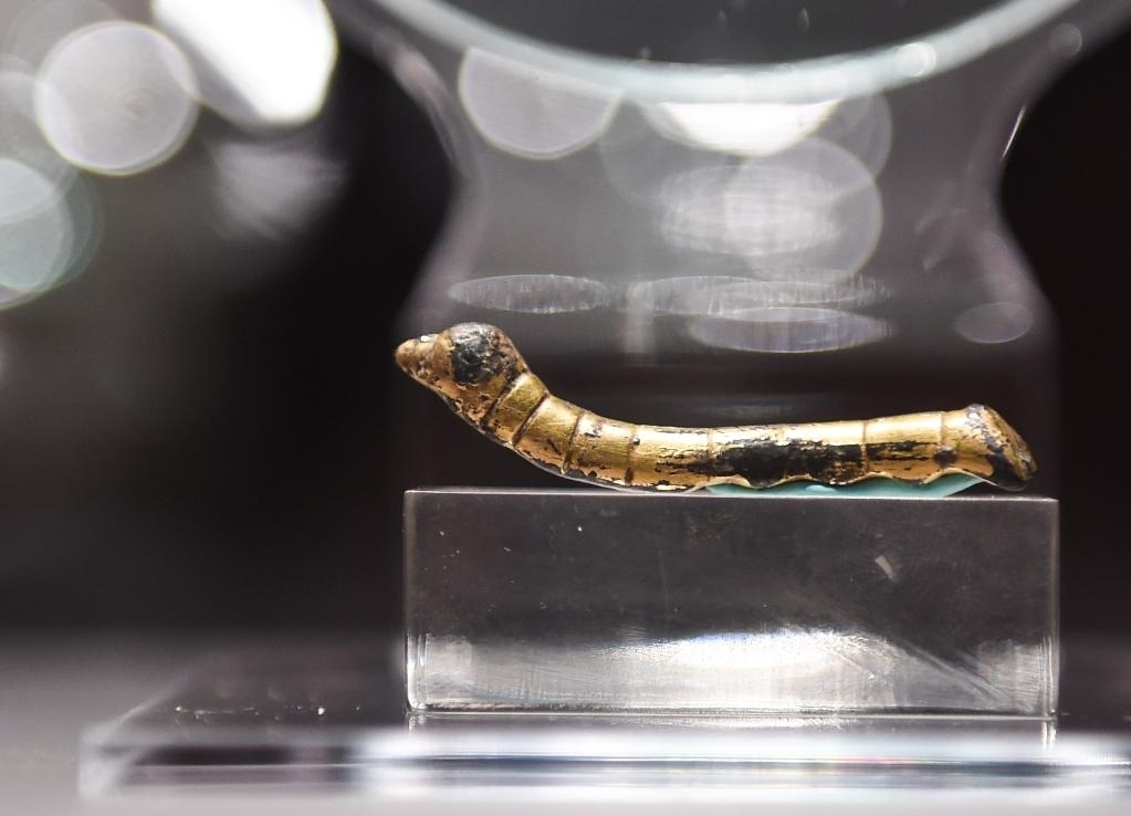 這條“鎏金銅蠶”1984年出土于陜西石泉縣,首尾共計9個腹節(jié),制作精致,造型逼真。新華社記者 羅曉光 攝