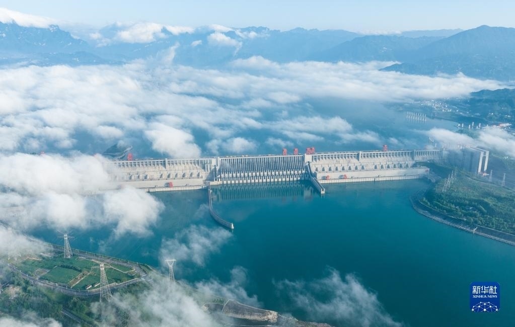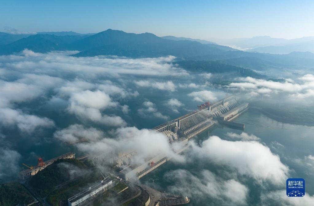 當(dāng)日,湖北宜昌雨過天晴,三峽上空云霧繚繞,美景如畫。