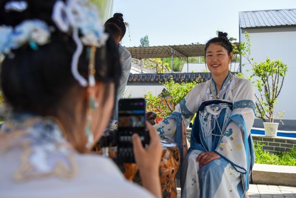 在新疆伊犁哈薩克自治州霍城縣大西溝鄉(xiāng)桃花村,游客穿著漢服在一家民宿內(nèi)拍攝短視頻(5月17日攝)。新華社記者丁磊 攝