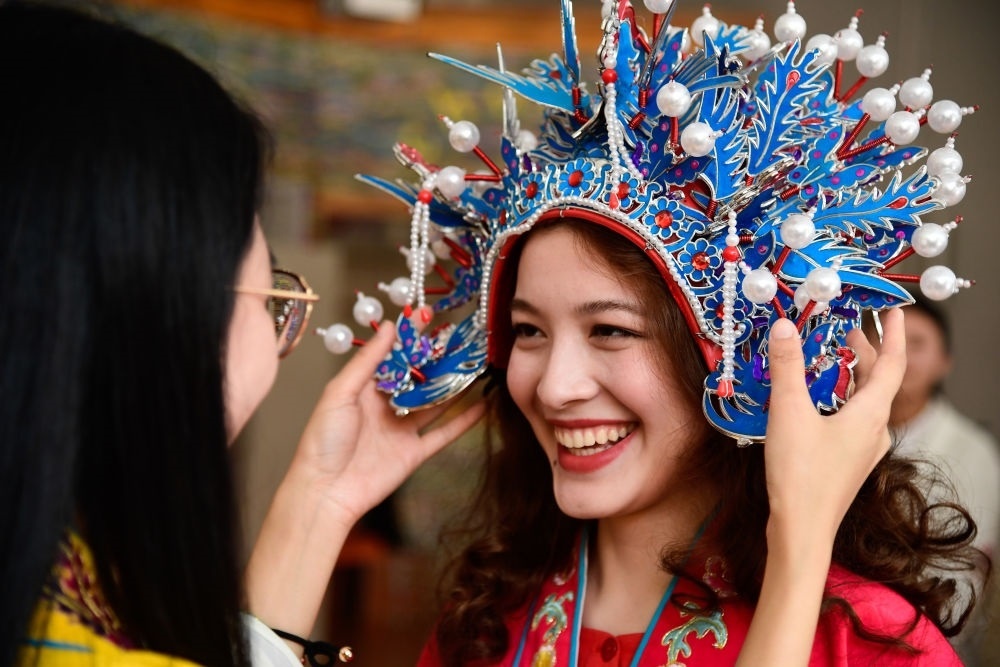 在青島的中國石油大學(xué)(華東)大學(xué)生活動中心,哈薩克斯坦留學(xué)生珍珠體驗京劇文化(2018年5月3日攝)
