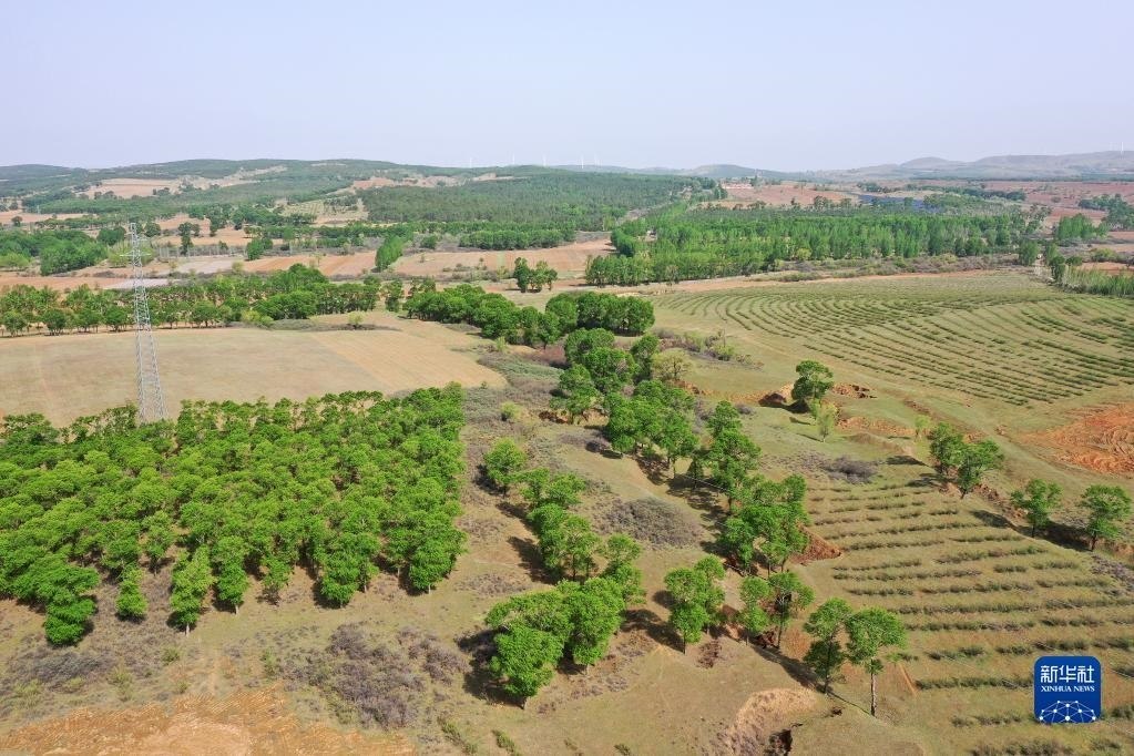 山西省右玉縣四臺溝村田園景色(5月18日攝,無人機照片)。