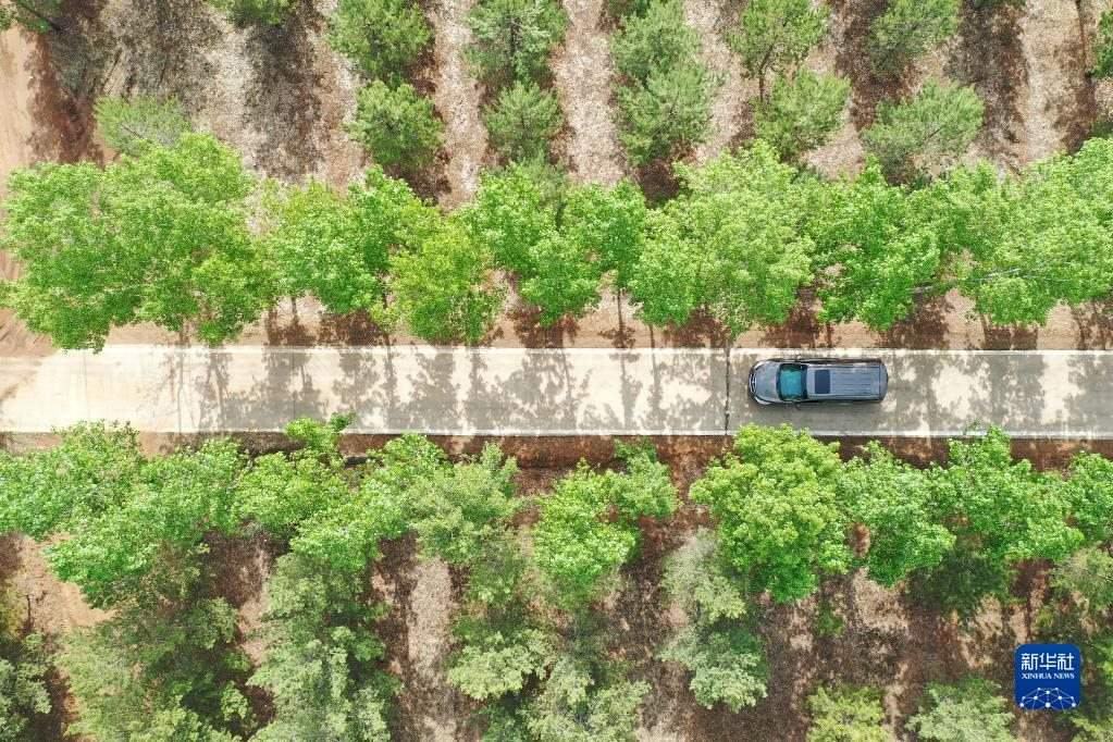 車輛在山西省右玉縣新城鎮(zhèn)道路上行駛(5月19日攝,無人機照片)。