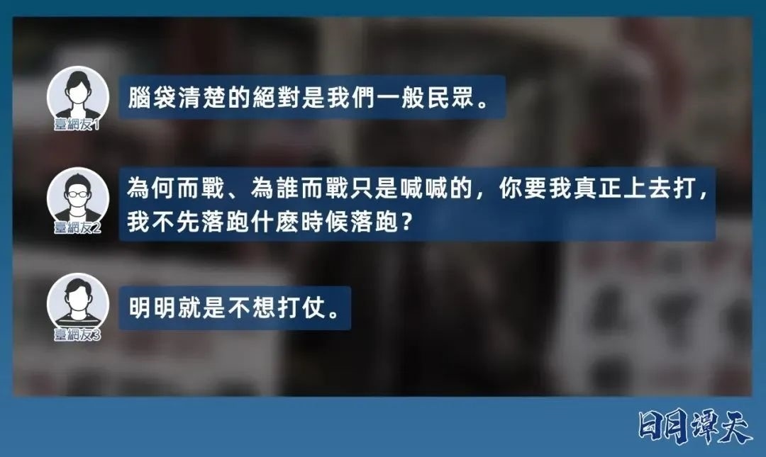 譚主一位來(lái)自新北的青年朋友小章說(shuō),他服四個(gè)月義務(wù)兵役時(shí)“每天都想要逃離”,服完役才感到解脫,那段時(shí)間的心情就是“來(lái)不及了快下車”“民進(jìn)黨就是‘臺(tái)獨(dú)’啊,我不想去給他們當(dāng)炮灰”。