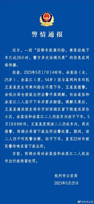 ·近日,杭州兩名乘客與網(wǎng)約車司機發(fā)生糾紛,賴在車上不走超過28小時,警方多次調(diào)解無果,最終兩名乘客被處以行政拘留。