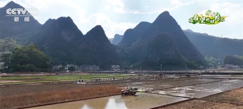 跟隨鏡頭,我們來到了貴州興義市的水稻高產(chǎn)示范田,插秧機(jī)正在田里忙碌,大小不一的水田正陸續(xù)插上嫩綠的秧苗。