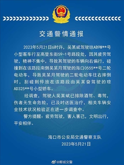 ·海口交警通報“一車輛沖上綠化帶撞倒環(huán)衛(wèi)工人”:司機(jī)疲勞駕駛,傷者無生命危險。