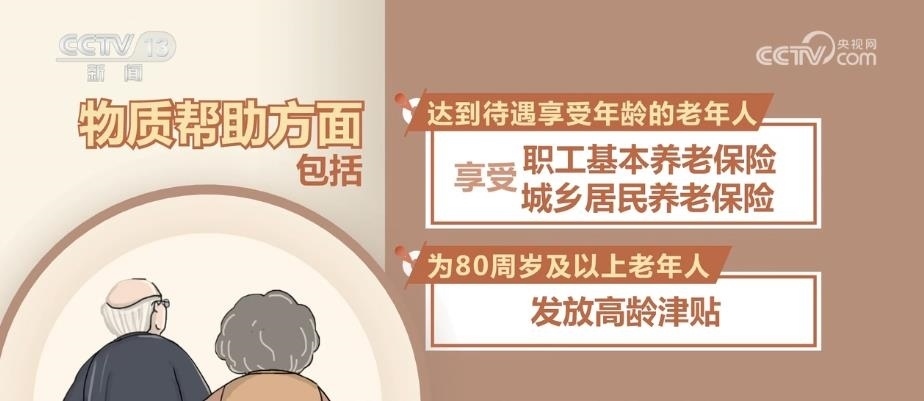 物質(zhì)幫助方面包括:達(dá)到待遇享受年齡的老年人享受職工基本養(yǎng)老保險和城鄉(xiāng)居民養(yǎng)老保險;為80周歲及以上老年人發(fā)放高齡津貼;為經(jīng)濟困難的老年人提供養(yǎng)老服務(wù)補貼;為經(jīng)認(rèn)定生活不能自理的老年人提供護理補貼;為納入最低生活保障范圍的老年人提供最低生活保障;經(jīng)認(rèn)定符合條件的殘疾老年人享受困難殘疾人生活補貼和重度殘疾人護理補貼;對生活無著的流浪、乞討老年人依照有關(guān)規(guī)定給予救助。