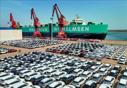 一艘滾裝船在江蘇連云港港東方港務(wù)分公司碼頭裝運出口汽車(2023年5月16日攝) 王健民攝 / 本刊