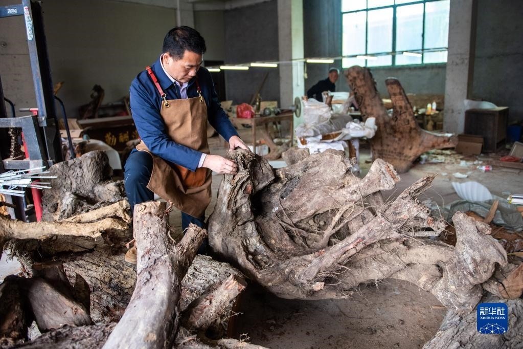 5月23日,在洞口縣巖山鎮(zhèn)陽家山村,洞口木雕非遺傳承人傅立先在挑選木雕材料。