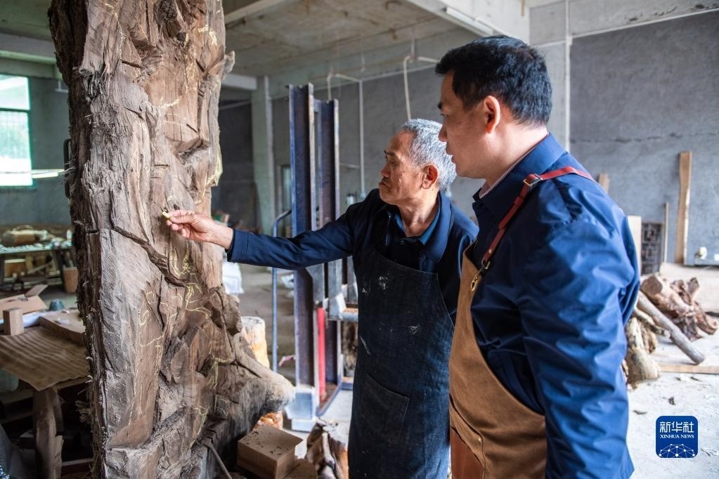 5月23日,在洞口縣巖山鎮(zhèn)陽家山村,洞口木雕非遺傳承人傅立先在創(chuàng)作木雕作品《絲綢之路》。