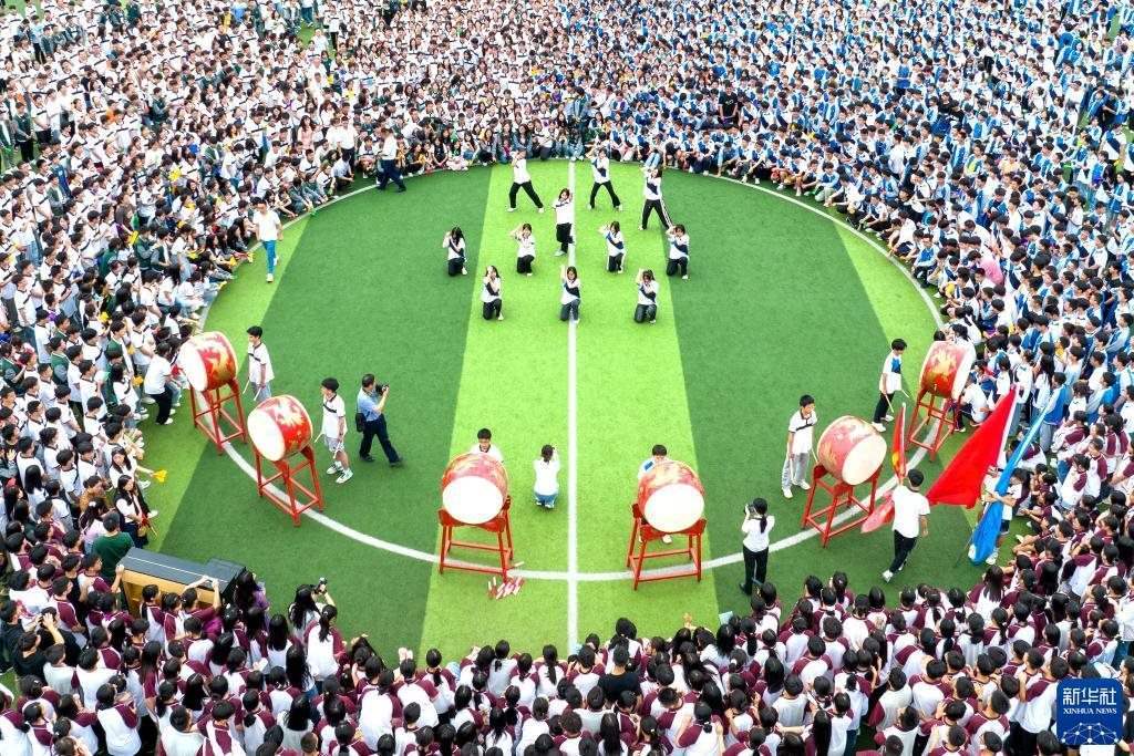 5月29日,湖北省宣恩縣第一高級中學(xué)學(xué)生在快閃活動中表演鼓舞(無人機(jī)照片)。