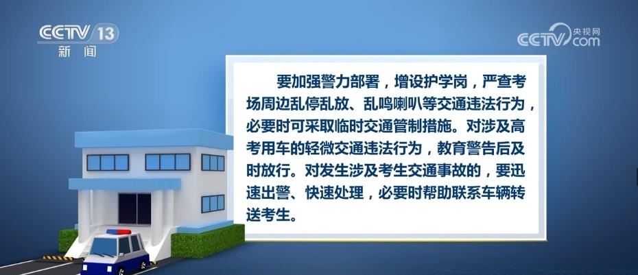 要加強警力部署,增設護學崗,嚴查考場周邊亂停亂放、亂鳴喇叭等交通違法行為,必要時可采取臨時交通管制措施。對涉及高考用車的輕微交通違法行為,教育警告后及時放行。對發(fā)生涉及考生交通事故的,要迅速出警、快速處理,必要時幫助聯(lián)系車輛轉(zhuǎn)送考生。
