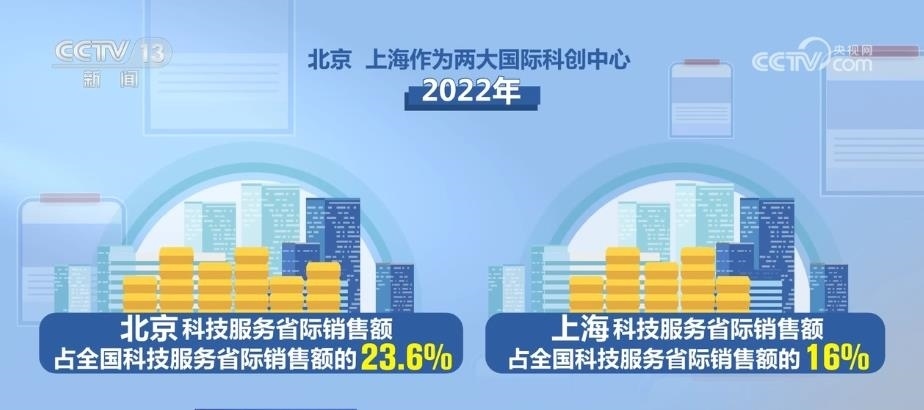 從創(chuàng)新來(lái)看,2017年—2022年,全國(guó)科技服務(wù)省際銷(xiāo)售額年均增長(zhǎng)28%,較科技服務(wù)總體銷(xiāo)售收入增速快4.2個(gè)百分點(diǎn)。今年截至5月20日,科技服務(wù)省際銷(xiāo)售額同比增長(zhǎng)29.7%,較科技服務(wù)總體銷(xiāo)售收入增速快2.6個(gè)百分點(diǎn)。北京、上海作為兩大國(guó)際科創(chuàng)中心,2022年科技服務(wù)省際銷(xiāo)售額分別占全國(guó)科技服務(wù)省際銷(xiāo)售額的23.6%和16%;2017年—2022年年均分別增長(zhǎng)22.1%和24.2%。