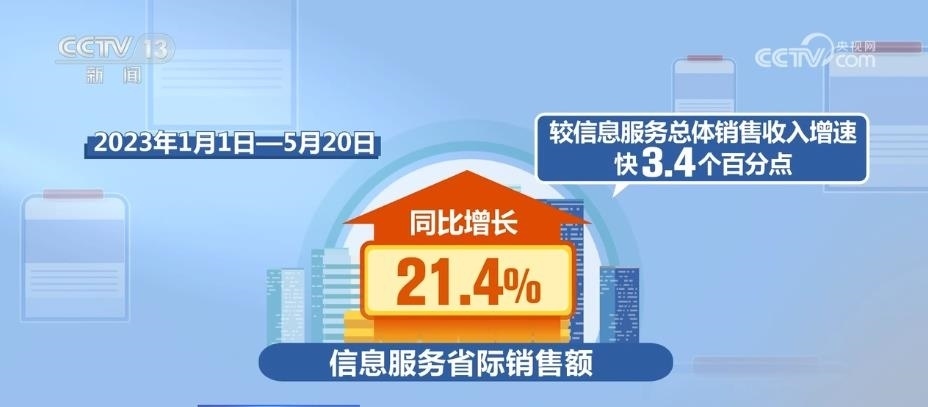 從信息方面來(lái)看,2017年—2022年,全國(guó)信息服務(wù)省際銷(xiāo)售額年均增長(zhǎng)22%,較信息服務(wù)總體銷(xiāo)售收入增速快2.8個(gè)百分點(diǎn)。2023年1月1日—5月20日,信息服務(wù)省際銷(xiāo)售額同比增長(zhǎng)21.4%,較信息服務(wù)總體銷(xiāo)售收入增速快3.4個(gè)百分點(diǎn)。