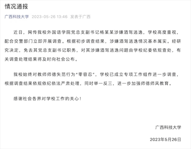·廣西科大通報學(xué)院副書記涉酒駕逃逸:免職,學(xué)校紀(jì)委介入。