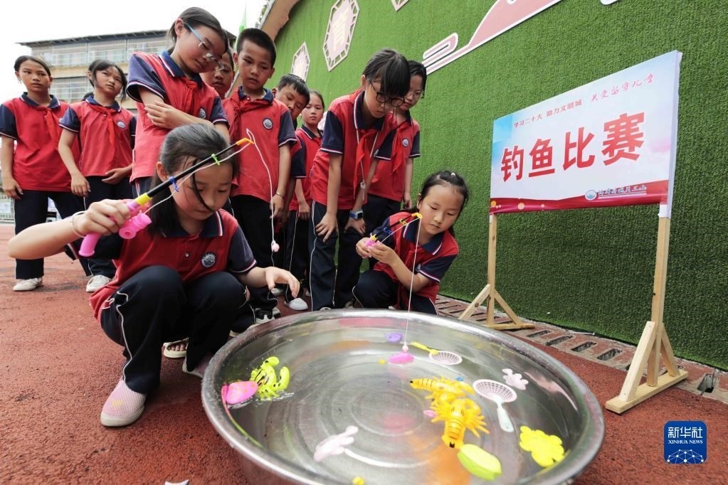 5月30日,貴州省錦屏縣城關(guān)第三小學(xué)學(xué)生在參加釣魚比賽。 新華社發(fā)(楊曉海攝)