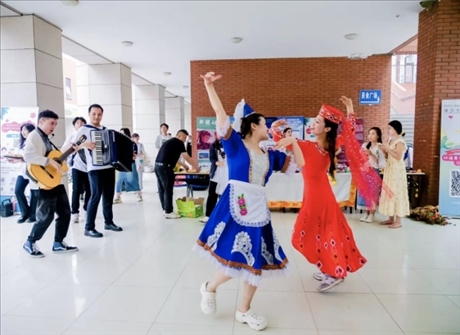 5月31日,“石榴籽 祖國行”新疆大學(xué)代表團來到南開大學(xué)。在故事分享會上,王彥臣、李姝洋、迪力亞爾·迪力夏提同學(xué)向南開大學(xué)青年學(xué)子講述了“斷臂男孩”阿卜杜外力·阿卜杜拉、“黨徽大叔”阿布都加帕爾·猛德和“時代楷?!崩R尼·巴依卡的故事。在文藝大舞臺上,新疆大學(xué)代表團各民族同學(xué)通過展示新疆特色舞蹈“木卡姆”、民族器樂“庫布孜”,向南開大學(xué)師生展現(xiàn)大美新疆熱情好客、能歌善舞的地域特色。