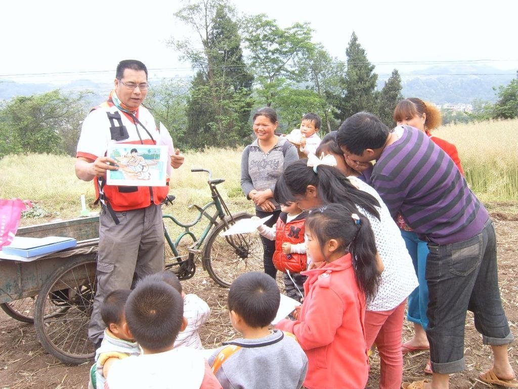楊海龍參與四川雅安地震救援時,給小朋友做衛(wèi)生宣傳。(受訪者供圖)