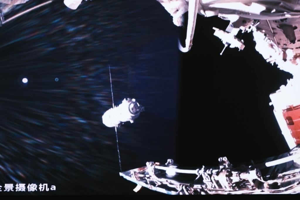 5月30日在北京航天飛行控制中心拍攝的神舟十六號(hào)載人飛船成功對(duì)接于空間站天和核心艙徑向端口的畫面。新華社記者 李杰 攝