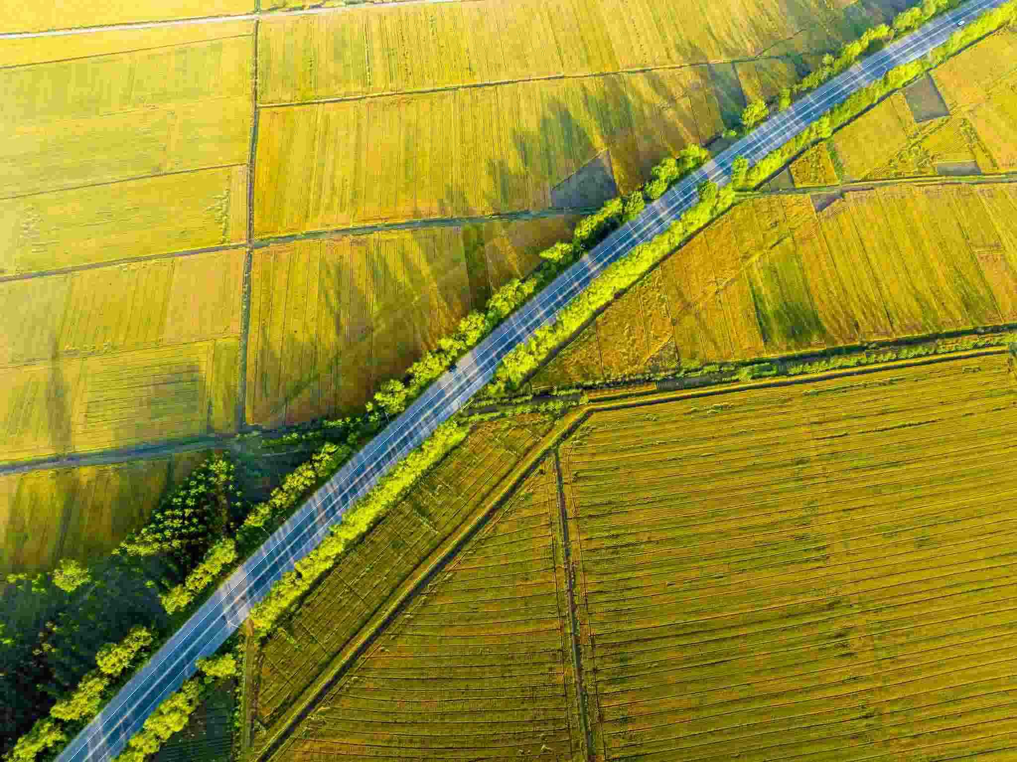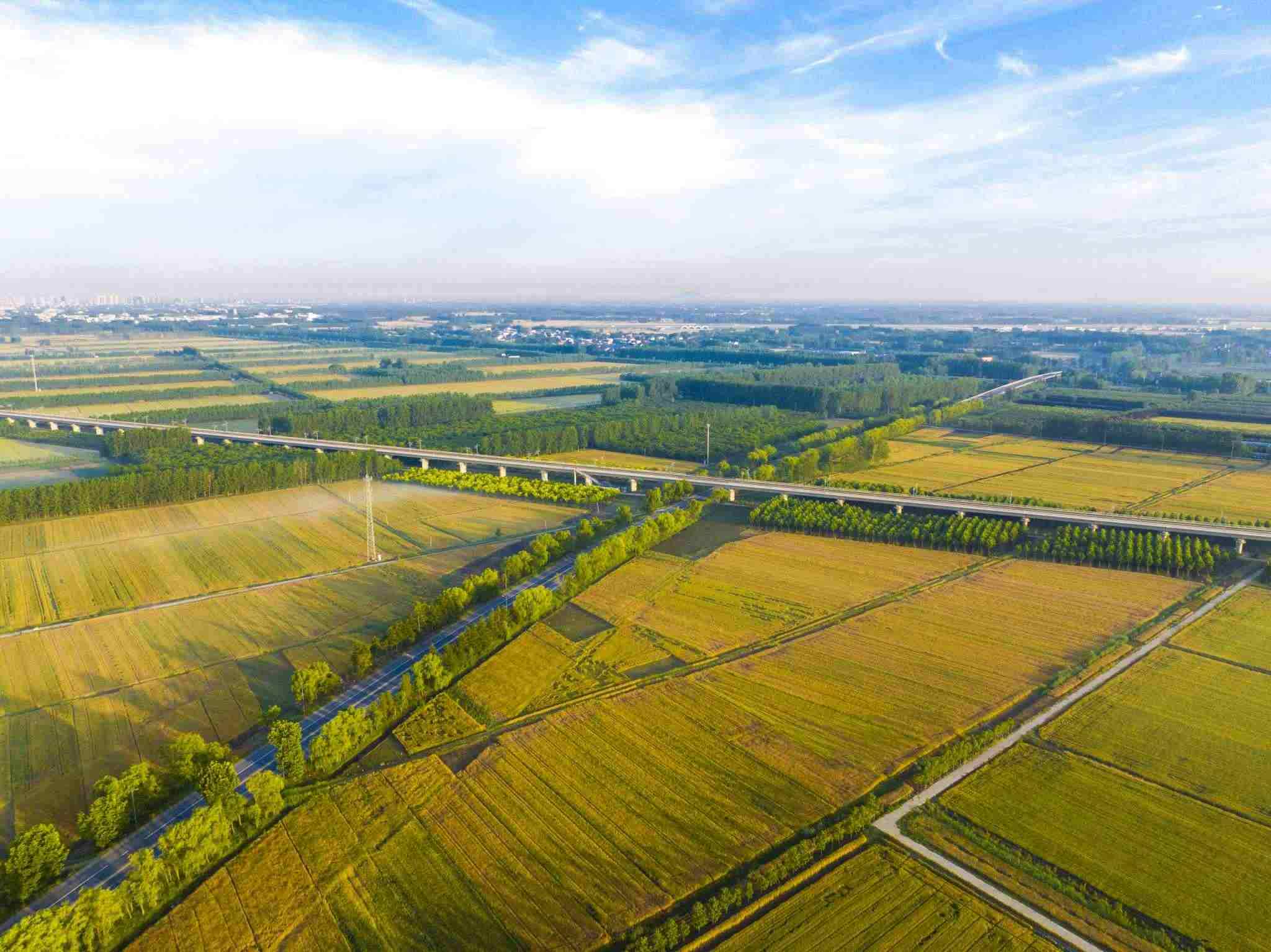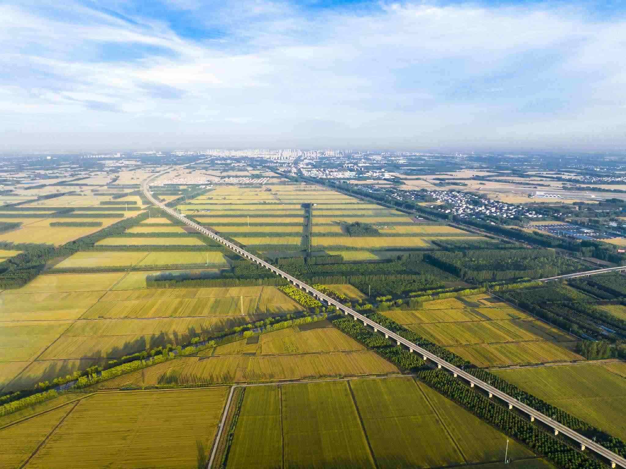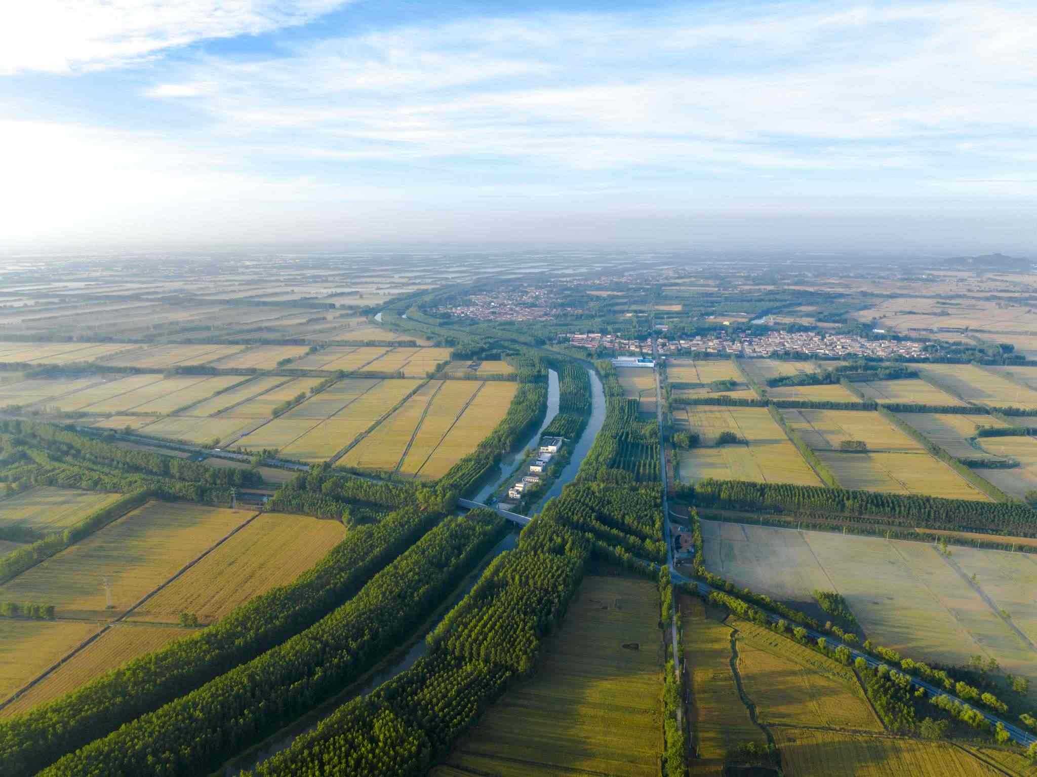 2023年6月3日,江蘇連云港,東海縣,金色田野與村莊、道路、河流共同構成了一幅秀美的夏日豐收畫卷。視覺中國