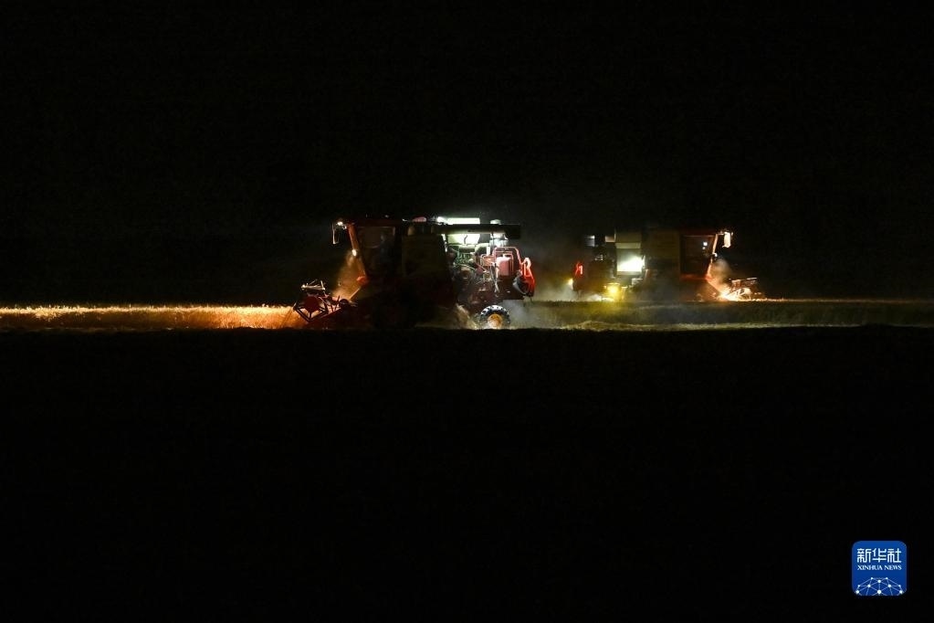 6月2日夜晚,在阜陽市阜南縣苗集鎮(zhèn)的一處麥田,農(nóng)機(jī)手駕駛收割機(jī)收割小麥。