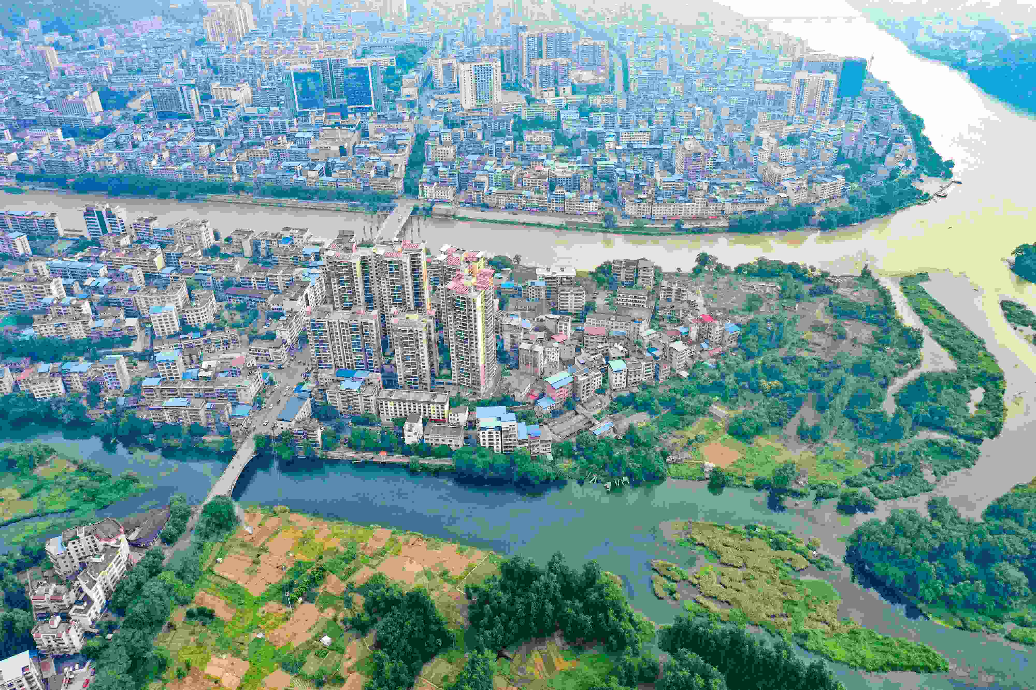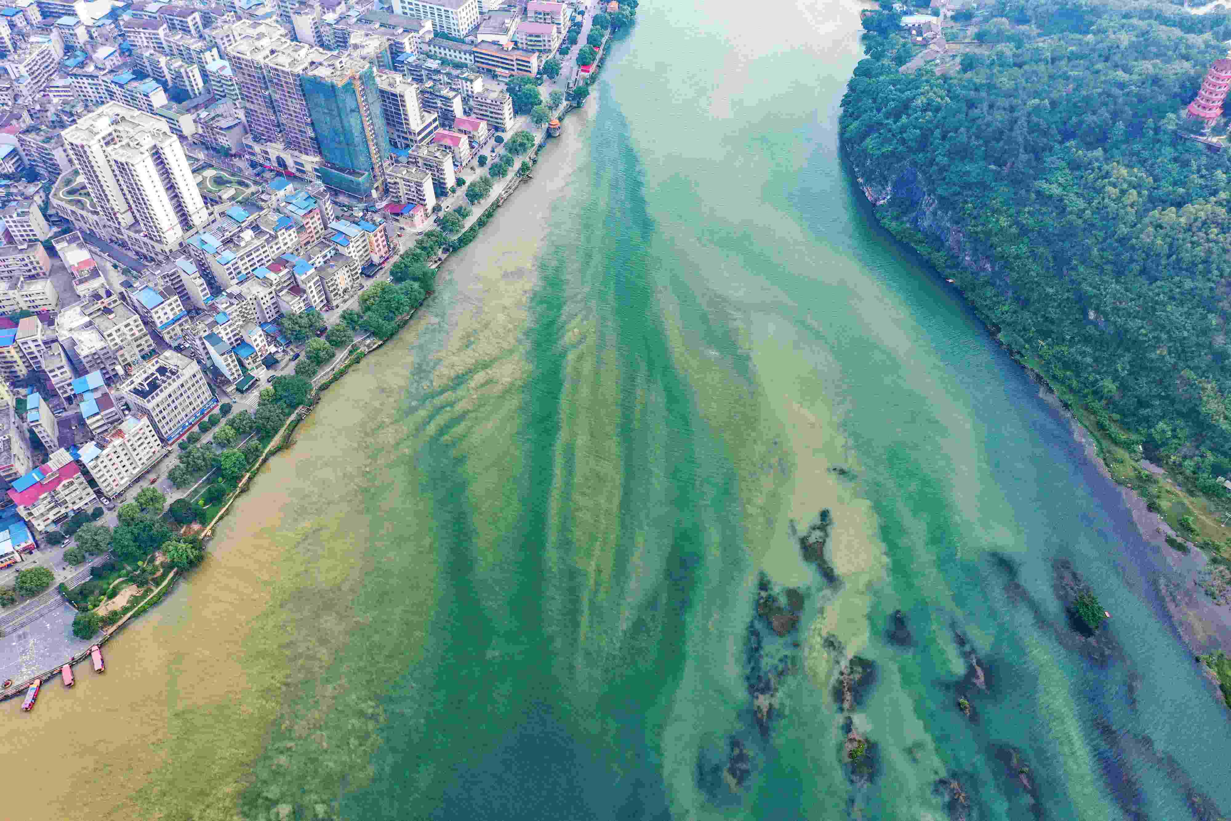 2023年6月4日,受降雨影響,廣西桂林全州縣城湘江河段出現(xiàn)涇渭分明景觀??罩懈╊娼Я魅f鄉(xiāng)河混濁的河水繞城匯入清澈的湘江干流,交匯之處涇渭分明。 視覺中國