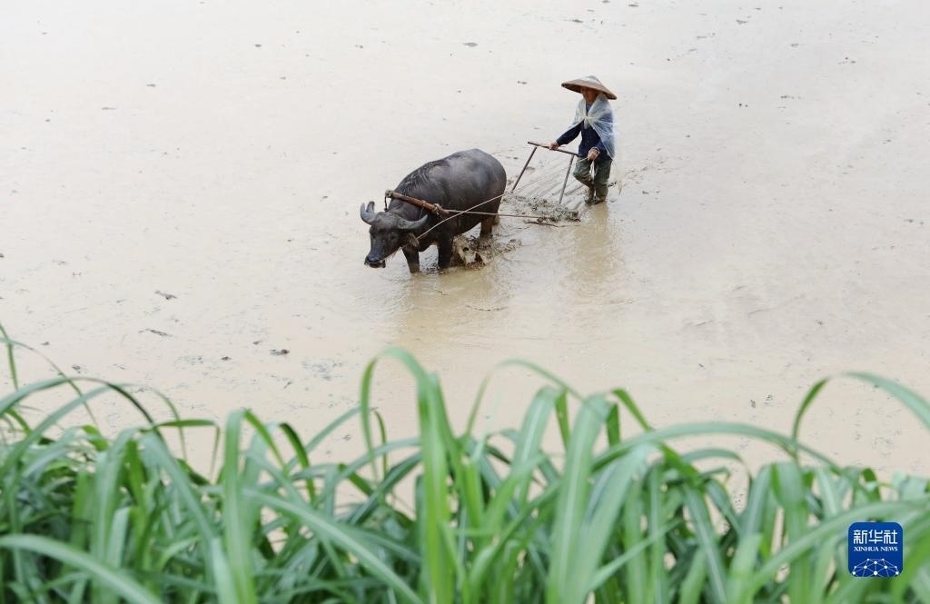 6月5日,在湖南省永州市道縣營江街道芒頭寨村,農民在平整水田。