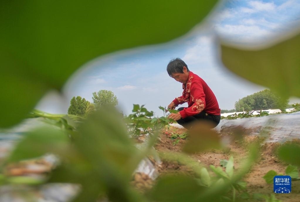 6月5日,村民在河南省商丘市夏邑縣會亭鎮(zhèn)西街北村田間補栽紅薯苗。
