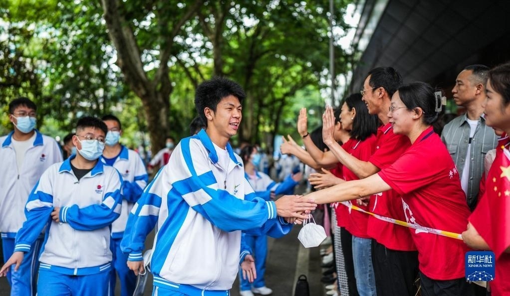 6月7日,在吉林省長春市五十六中學(xué)考點(diǎn),考生入場前與送考老師擊掌。
