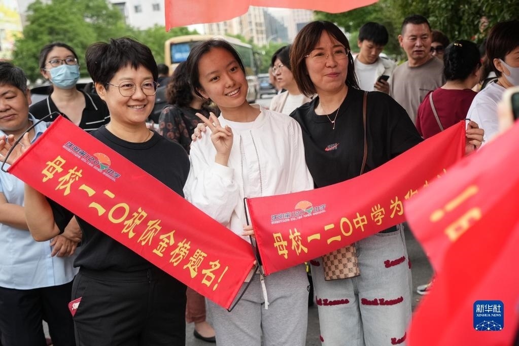 6月7日,考生在遼寧省實驗中學(xué)考點(diǎn)外與老師合影留念。