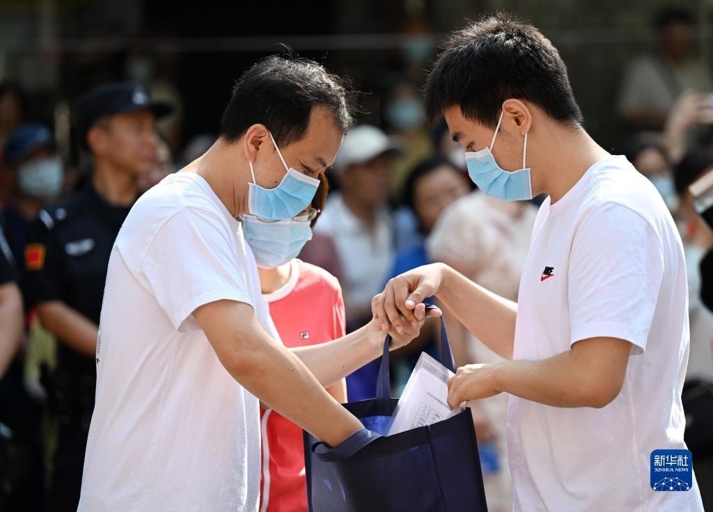 6月7日,在北京師范大學(xué)附屬實驗中學(xué)考點(diǎn)門口,考生家長給考生加油打氣。