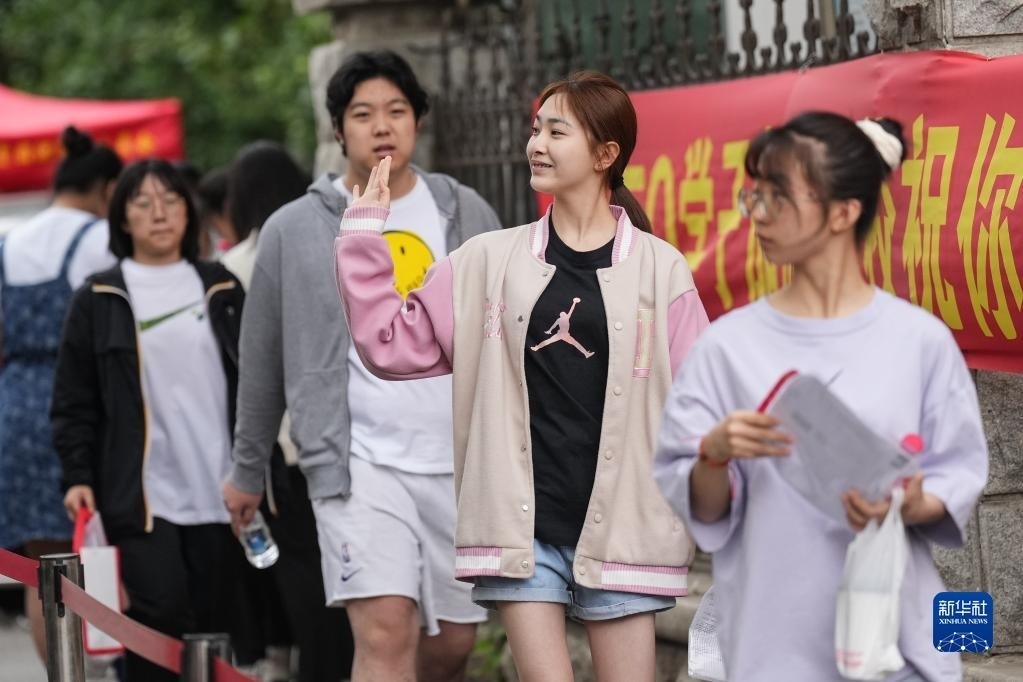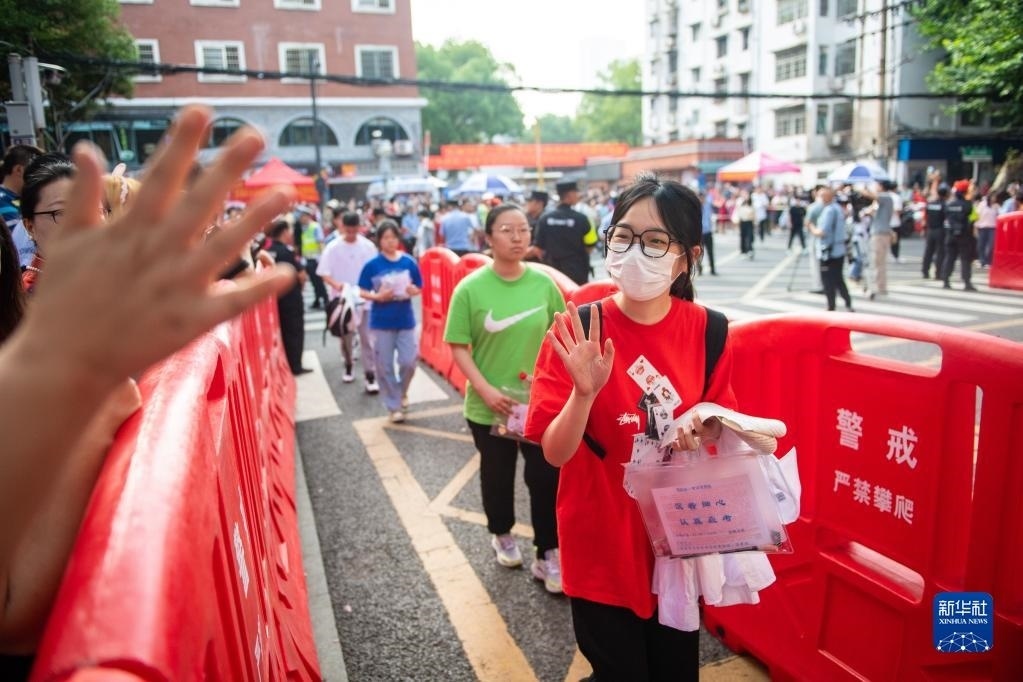 6月7日,在北京師范大學(xué)附屬實驗中學(xué)考點(diǎn)門口,考生走進(jìn)考點(diǎn)后向家長揮手。