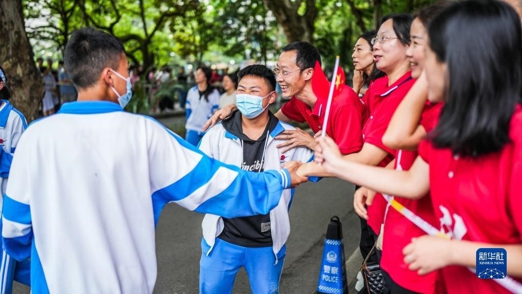 6月7日,送考老師在貴陽市烏當(dāng)中學(xué)考點(diǎn)給學(xué)生加油打氣。
