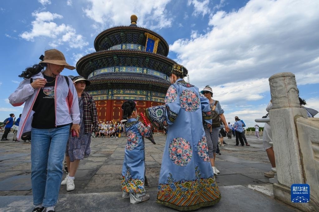 6月9日,游客在天壇祈年殿游覽。