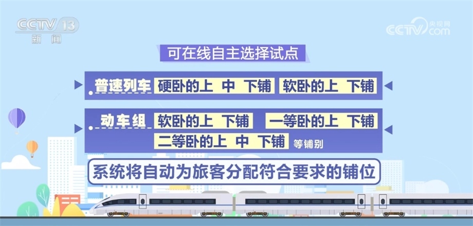 這次試行在線選鋪服務的230趟旅客列車,主要針對普速旅客列車和部分高鐵列車,涵蓋范圍包括普速列車的軟臥、硬臥和動車組的軟臥、一等臥、二等臥等鋪別。同時,繼續(xù)實行對60歲以上老人等重點旅客優(yōu)先分配下鋪的服務。