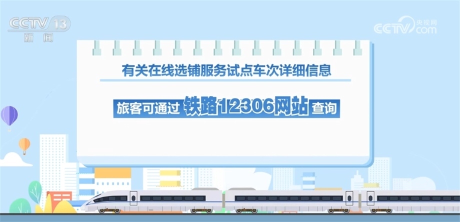 央視網(wǎng)消息:記者從國鐵集團獲悉,今天(6月10日)起,鐵路部門將在12306網(wǎng)站和12306手機客戶端試行在線選鋪服務。