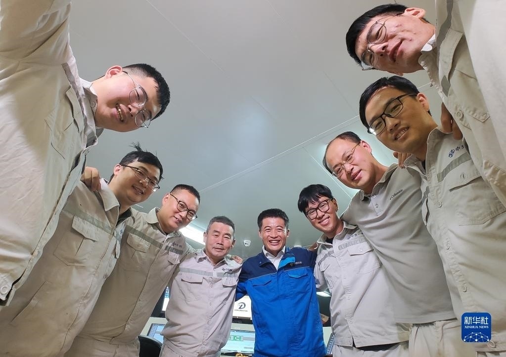 6月11日,在深中通道海底隧道管節(jié)最終接頭合龍后,中交一航局深中項目測管中心負責人鎖旭宏(中)和團隊成員一起慶賀。